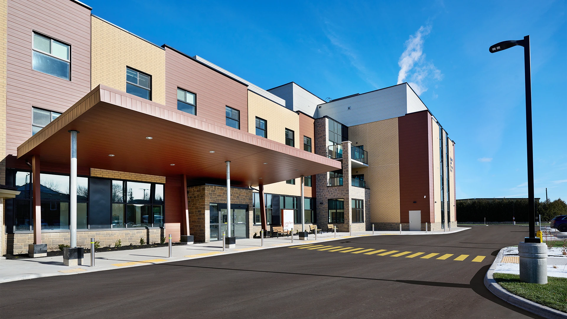 The new 3-storey, 160-bed home features small home areas with a focus on community feel and universal accessibility. The spacious entrance features a fireplace lounge, sitting area and reception.  A combination chapel/multi-purpose room allows for large gatherings with access to an exterior courtyard.